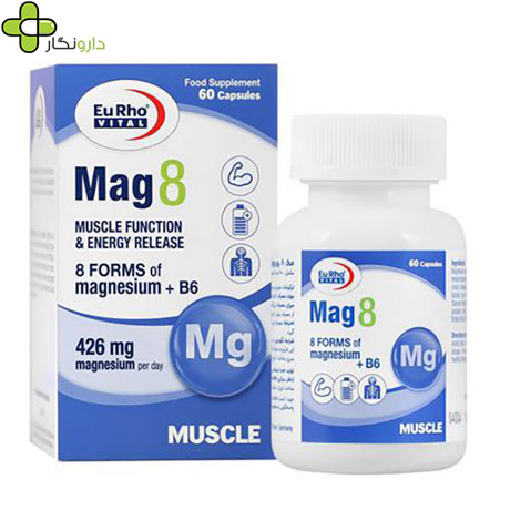 کپسول مگ 8 یوروویتال حاوی 8 ملح مختلف منیزیم (بیسگلایسینات، سیترات، مالات، لاکتات، تائورات، اکساید، گلوکونات و آسکوربات) بههمراه ویتامین B6 است که به تقویت عملکرد سیستم عصبی، رفع گرفتگیهای عضلانی، افزایش توان جسمی و بهبود خلقوخو کمک میکند. وجود 8 ملح متنوع منیزیم در این مکمل باعث جذب بهتر و اثربخشی بالاتر منیزیم در ابعاد مختلف سلامتی میشود.